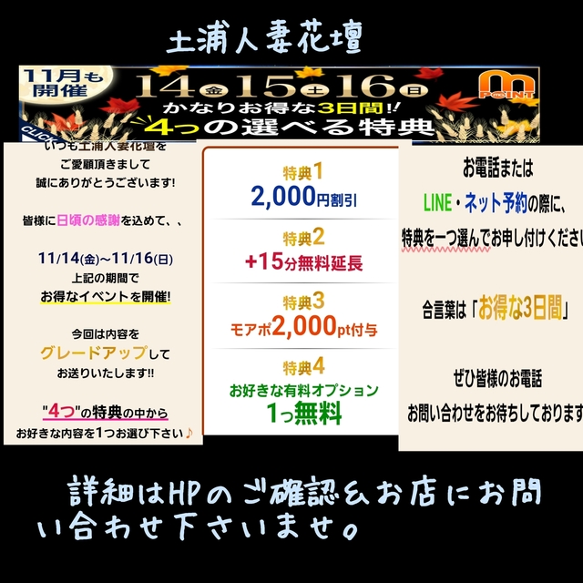 本日11/14(金)は土浦/つくば人妻花壇は【お得な3日間イベント】【11月会員特典(虫掛エリア割引)】【ご新規割引】【口コミ投稿特典】【アンケート特典】【モアポW特典】開催日です