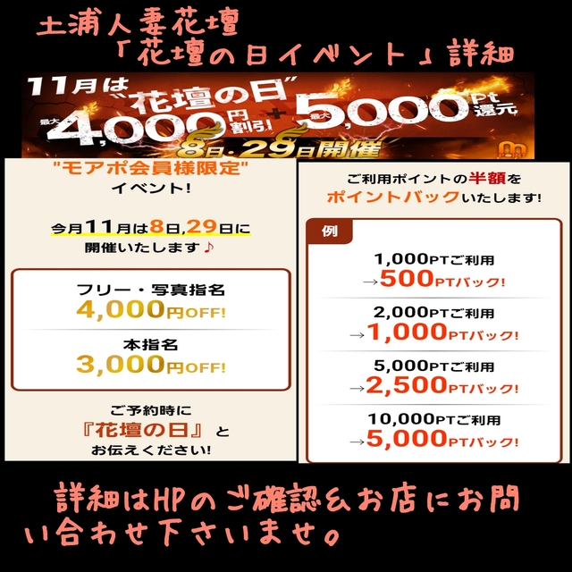 本日29日(土)は土浦人妻花壇【花壇の日イベント】【11月会員特典(虫掛エリア割引)】【ご新規割引】【口コミ投稿特典】【アンケート特典】開催日です