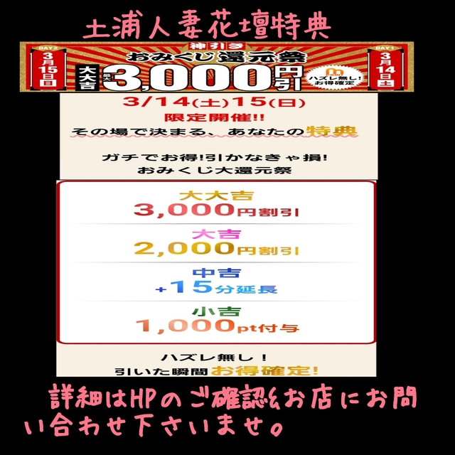 💡本日3/14日(土)は土浦/つくば人妻花壇【🆕おみくじ還元祭🈹】【🆕花壇の日イベント🈹】【3月ラインモアポ会員特典(事前予約割引)】【カムバック割引🈹】【ご新規割引】【口コミ投稿特典】【アンケート特典】開催日です🉐